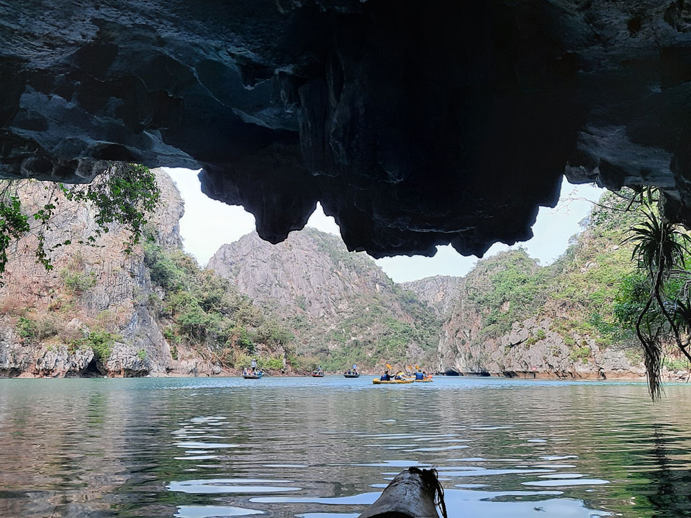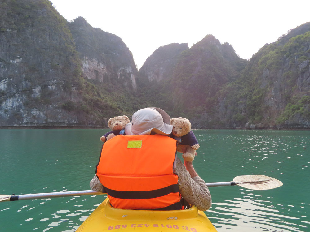 Then we were in Ha Long Bay, where it’s wonderful limestone mountains emerged from the calm sea. Ha Long Bay has amazing island scenery with its 2,000 dramatic limestone islands and extraordinary rock formations dating back 20 million years. Tourism had come to this place en mass since 2011 and we reckoned there were about 100 tourist ships there. The sun was just about out , so we were in luck and soon after 3 pm, we went out in a kayak, David doing all the work. Only seven out of the 21 ventured out in this way, six Brits and one American. The others did their tour of the caves and lake behind in a sort of a bamboo craft. The scenery on this was really magnificent.