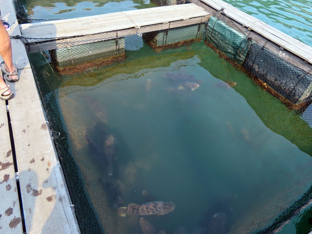 After lunch we stopped at a fish farm, at Ha Long Bay , where there were some 20 large tanks separated by fairly narrow planks along which the punter had to walk: this was a slight challenge for Chris but other people had problems with their balance too.
